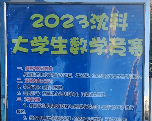 为激励大学生学习数学的兴趣,培养学生分析问题、解决问题的能力,提升我校人才培养质量,促进学校数学课程建设,基础与通识教学部举办了2023年沈科大学生数学竞赛。在策划和组织这次活动的过程中,我们注重细节和落实,制定了详细的比赛规则和评分标准,以确保比赛的公平性和公正性。在宣传和推广方面,我们通过多种渠道进行宣传,比如宣传海报、QQ群等。我们向学生们宣传了数学竞赛的意义和好处,鼓励他们积极参与。......